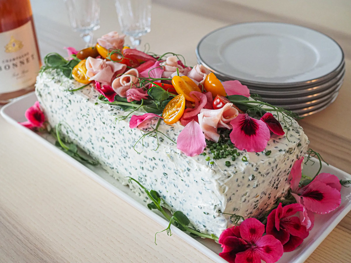 Voileipäkakku kannattaa tietysti koristella makumaailmaan sopivilla raaka-aineilla. Tähän kakkuun otin hieman toisenlaista kinkkua koristeruusuja varten. Leppäsavukinkku on liian mureaa, eikä taivu nätisti ruusuiksi. Erilaiset versot, yrtit ja syötävät kukat toimivat aina. Lihakakkuun sopii ruohosipuli ja kalakakkuun myös tilli. Syötävillä kukilla saa näyttävyyttä ja väriä vaikka juhlien väriteemaa mukaellen. Tässä kakussa on käytetty pelargonia.